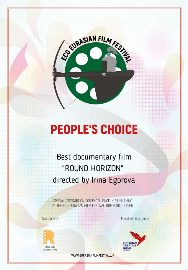 2020 г. Фильм ROUND HORIZON («Круглый горизонт»), исправленный и дополненный субтитрами на английском языке удостоен награды Второй Евразийский кинофестиваль в Лондоне 2020 (eurasianfilmfestival.uk) Приз зрительских симпатий EURASIAN FILM FESTIVAL] (Фестиваль ЕВРАЗИЯ) в Лондоне, режиссер Ирина Егорова (Россия).